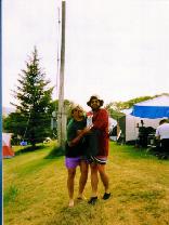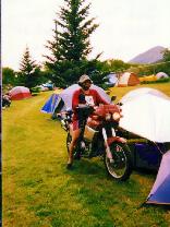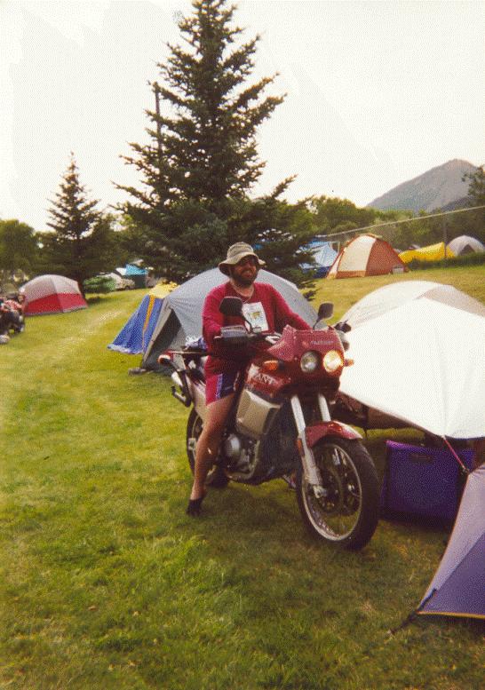 Finding the Rally site was easy. The flood of bikes must have looked like someone has stepped on an ant colony. The large parking lot was wall-to-wall bikes and every inch of shaded ground had a tent on it. After signing in and checking the bulletin board for pointers to fellow netters, we headed out to look for a campsite. A helpful staffer mentioned that there might be room to camp behind the ballfield so we wound our way through the sea of bikes and tents to find plenty of room albeit without any shade.