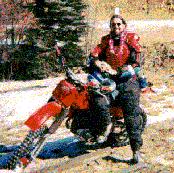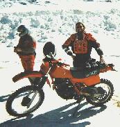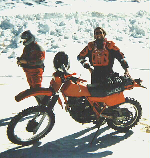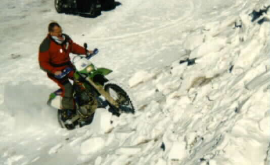 Steve spent a while looking at the huge snowbanks at the top (piled up by the snow plows) and his KDX. Eventually, he mounted up and made a run at the bank The bike made decent progress up the 45 degree bank but eventually slowed and the rear tire dug in, leaving the bike stuck upright on the slope. This spurred Deeney into mounting the might XT and making a run. Again, good progress was made but the lack of momentum eventually caused the rear tire to dig in. Deeney wasn't easily swayed, so more attempts were made, each getting higher. All this got Mr. XR400 moving and soon both bikes were rushing the snow bank. Even the CB750 got into the act with spectacular (though less successful) results. The XR400 pilot eventually reached the top, amid he applause of the crowd. However, this achievement was soon topped as a '46 Indian Chief made some attempts. These didn't get very far up the embankment but made for huge entertainment value as the bike augered into the snow and sent the rider flying. Ouch, Pt III!