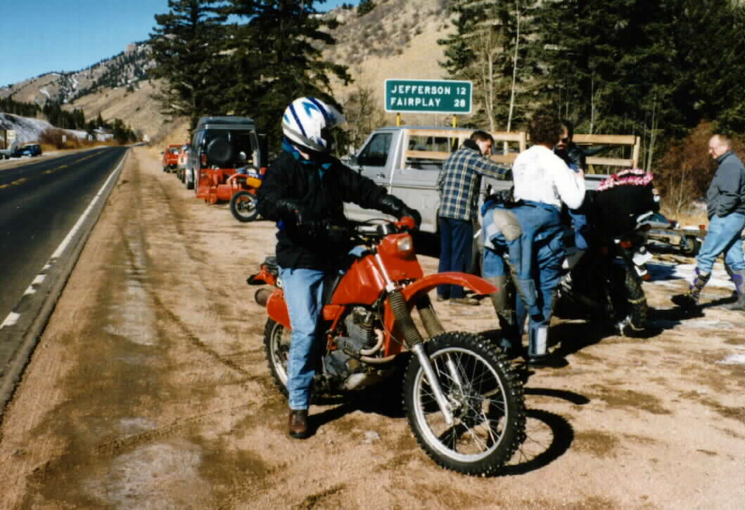 A little over an hour later, after an unsuccessful attempt to find a place to gas up my XR, we pulled into a nearly empty parking lot along side 285 in Grant, CO. A couple of empty bike trailers, a van/trailer combo with a modified Suzuki PE and a Honda XR400, a truck/trailer with two 4-wheelers and a pickup with a Yamaha TT500 aboard were all in the parking area. Another collection of bikes was parked in front of the restaurant next door includings a early 70s Honda CB750K, a Yamaha Venture with snow mobile cleats on the tires and a Honda Transalp with California plates and lots of camping gear strapped on.