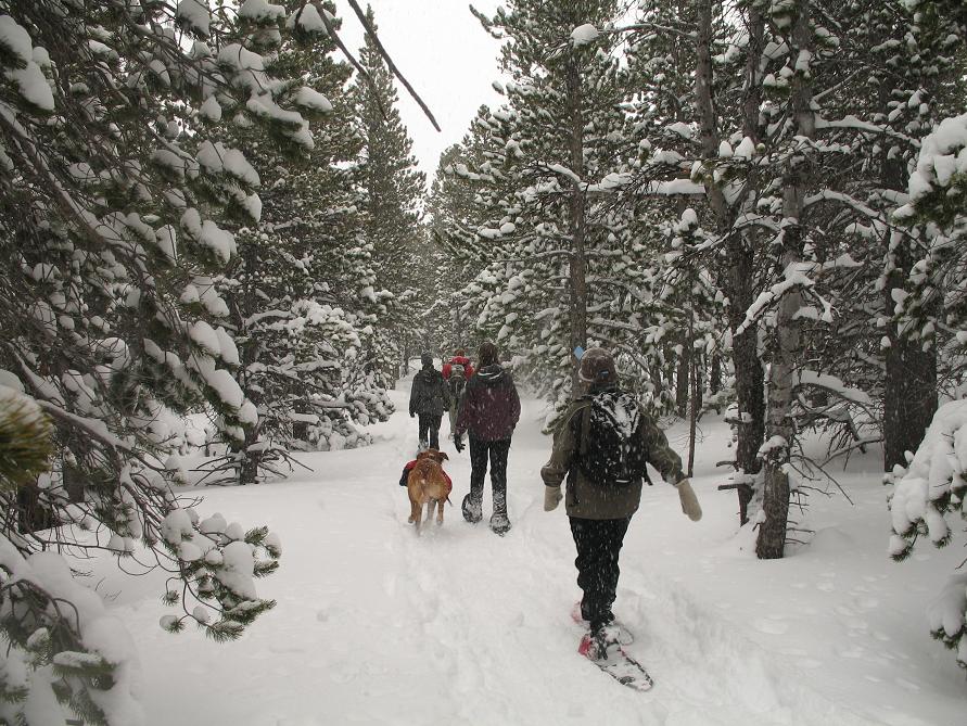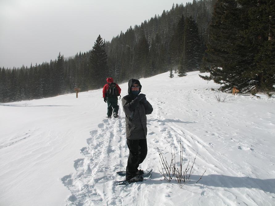 5) Sourdough Trail, CO - January 25, 2009 - Our friend Desiree again joined our usual hiking team for a snow shoe hike on the Sourdough trail. It was typical Colorado weather: We met under blue skies, started hiking with light snow, went through near blizzard conditions and then ended back under blue skies with bright sunshine. Through it all, the powder was perfect and the weather relatively warm. We hiked in about 2 1/2 miles, then headed back for a total of around 5 miles.