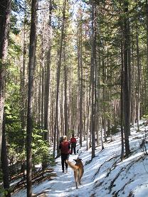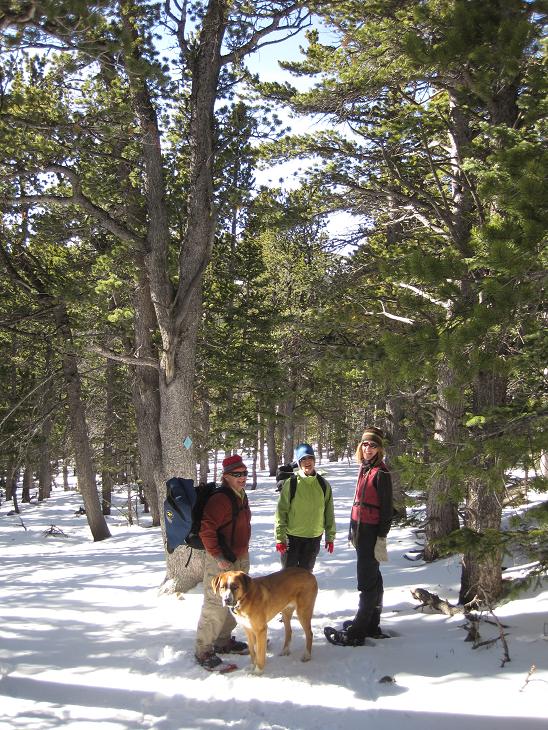 7) Forest Lakes, CO - February 8, 2009 - Our regular hiking crew was able to add another guest to our weekend hikes as our friend Krista wanted to try out her new snowshoes. In an attempt to find snow we headed up to the Moffat Tunnel trailhead but with the intention of hiking the Forest Lakes trail this time rather than our usual Heart Lake trail. Unfortunately, Jonna and Krista only hiked the first miles in and the warm, sunny weather had made the snow too wet and hardpacked to use the snow shoes. After Jonna and Krista turned back Alan, Lyle, Holly and Buster continued on for another mile and a half before running out of trail just short of the lakes. All in all, a fun hike totalling around 5 miles and with some good elevation as well.