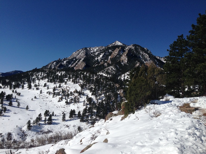 11) Bear Peak, Boulder Open Space & Mountain Parks, Boulder, CO, March 27, 2016 - It was just Lyle and Alan this weekend and with lots of fresh snow on the ground we decided to make an adventure out of it by climbing Bear Peak. We nearly bit off more than we could handle! We started at NCAR and, thanks to our micro-spikes, we managed to hike the icy trails from there to the Mesa trail. From there we tackled the ultra-steep Fern Canyon trail up to the peak - always a good hike but challenging with all the ice and snow. Our reward was stunning views of both a snow-covered Boulder down below and the snow-covered Rockies to the west. The questionable decision was our choice to hike back down via the west face of the mountain. Only one set of foot prints marked the way through the waist deep snow but we plunged down anyway. After an exhausting five miles of busting through heavy, wet, un-even snow we finally made it through Bear Canyon and back to the Mesa trail. Despite the perfect hiking weather we shuffled the last mile back to NCAR like oblivious zombies. A challenging 8.8 mile loop with 2,700 feet of elevation gain.