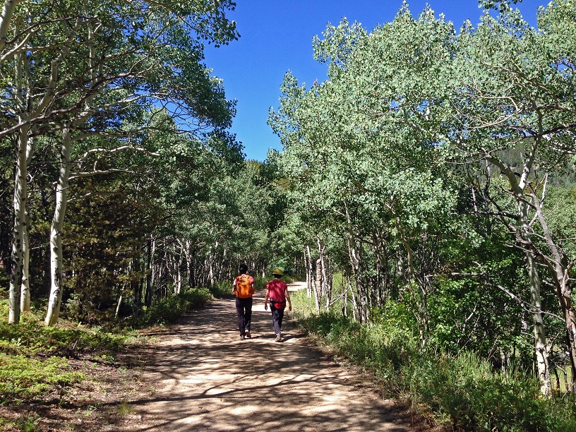 28) Buckeye Mountain, 512 Forest Service Road, Rollinsville, CO, August 7, 2016 - Alan was again on-call at work but still joined Lyle for a quick weekend hike. Last weekend we had spotted forest service road 512 forking off from where we were hiking on FS 105 so we returned this weekend to explore it. FS512 climbs up the side of Buckeye Mountain through a thick pine forest that has some beautiful aspen groves in it and past both the Fairheaven and Melett Mine sites. We kept hoping for a good panoramic view of the Divide but only got a few small glimpses through the trees before we decided to turn back for the trailhead. 4 miles out and back with 1,000 feet of elevation gain.