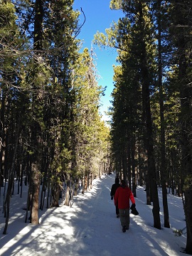 47) South St. Vrain trail #909, Brainard Lake Recreation Area, Ward, CO, December 23, 2016 - Jonna and Alan snuck in a pre-Christmas hike so we could enjoy the beautiful sunshine the mountains were getting going into the holiday weekend. A avoid the gusting wind we headed into trees on the South St. Vrain trail. The trail was mostly packed snow but periodic drifts where the wind could get through trees kept it interesting. 3 miles with 600 feet of elevation gain.