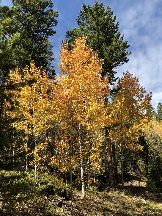 34) East Magnolia trail system, Nederland, CO, September 30, 2018 - We got together with our friends Holly and Rick for a short hike to see the last of the Fall aspen leaves. We headed to our old standby - the east end of the East Magnolia trail system where there are a few large groves of aspens. Sure enough, there were still plenty of gold and yellow and orange leaves on display. We were only out for a quick hike so we just did a walk to and through the main grove before circling back to the car but the crunch of dry leaves, the rustle of the breeze through the trees and the golden glow of sunlight through the tree tops was definitely the way to ring in the changing of the seasons. An easy 2.5 miles with a mellow 150 feet of elevation gain.