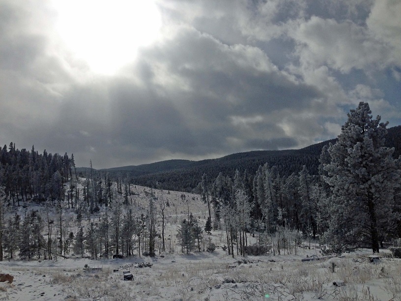 5) Bright Trail, Johnny Park trail system, Pinewood Springs, CO, February 1, 2018 - Neither snow nor rain nor heat nor gloom of night stays these hikes from the exploration of their appointed trails... or something like that. Todd, Lyle and Alan headed out into the tail end of a snow storm for a Mid-week Retiree Hiking Club outing. Todd volunteered to show Lyle and Alan some of the trails near his home so we headed up the snow-covered 4X4 roads into Johnny Park to where the road was blocked for the winter. From there we climbed up Tom's Trail into the national forest for a long, cold loop that connected to the north end of the Bright Trail. We explored a little of that trail, until the freezing wind turned us back, and then returned to the trailhead via an unnamed mountain bike trail that climbed to the top of the highest hill in the area. We hiked through snow clouds and hiked through forests of trees that were fully encased in frost. It was really spectacular...and really cold. Did I mention the cold? 9.5 miles with 2,150 feet of elevation gain.