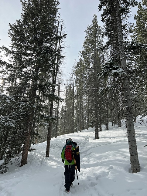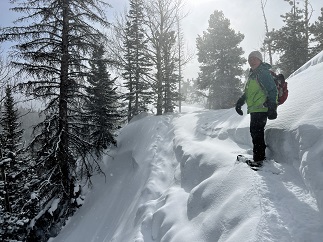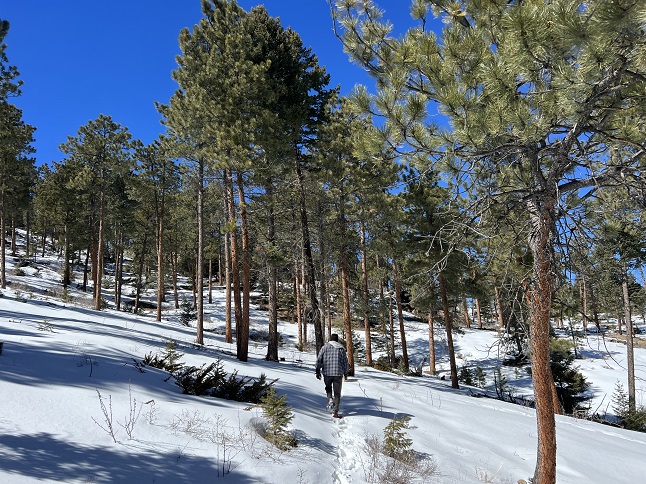 7) Shelter #1, Beaver Trail, Golden Gate Canyon State Park, Golden, CO, January 24, 2023 - Alan is a hiking fool right now - three straight days of hiking! Lyle and Alan headed into nearby Golden Gate Canyon State Park to hike a trail we haven't been on in about 8 years - the Shelter #1 trail. This is one of the least used trails in the park and was a trail we would regularly hike from the Visitor Center parking lot but a couple of years ago the trail was re-routed and we hadn't been on it since then to check it out. With only ankle deep snow we braved just hiking it with not traction or flotation footwear. It was slippery on the steeper sections but otherwise just fine with just hiking boots. The sun was playing hide-and-seek with the clouds so the temperature fluctuated from around 18 degrees to around 25 degrees depending on whether the sun was out or not. The climb up was slow and steady but the snow covered pine trees and bare aspens provided beautiful scenery for a leisurely pace. We stopped briefly at the camping shelter but the cold temperature motivated us to keep moving. The way down was much steeper and provided opportunities to try the sport of boot skiing, something I'm not particularly graceful at but managed to keep from falling so there must be some latent talent there. It was a nice hike with good company and a good workout to start getting in shape for the upcoming hiking season. A 3.6 mile loop with 1,050 feet of elevation gain.