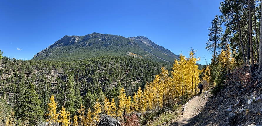 82) Estes Cone, Lily Lake Trailhead, Rocky Mountain National Park, Estes Park, CO, October 9, 2023 - After a relaxed weekend, primarily determined by having gotten our COVID and Flu vaccines, we were back hiking first thing Monday morning. We again headed to Rocky Mountain National Park but this time we started from the Lily Lake trailhead with Estes Cone being our destination. This isn't a super long hike but the final climb up to the peak is nature's own StairMaster so it was another good training hike. We got started early and with Fall firmly in place that meant there was frost on the ground. It took over an hour for the sun to finally break over the top of Twin Sisters to the east and get us some sunshine with which to warm up. As the hike went along the temperature steadily grew but so did the breeze so the chill felt about the same. Up on top the wind was gusting pretty strongly but we managed to find a protected area where we could enjoy our snacks and sneak a peek of the amazing panoramic view. Then it was back down off the peak and then the steady decent as the trail wound around the south flank of the mountain to return to Lily Lake. Another scenic hike and some more steep elevation gain to give our legs a workout. A 7.5 mile up and back with 2,300 feet of elevation gain.