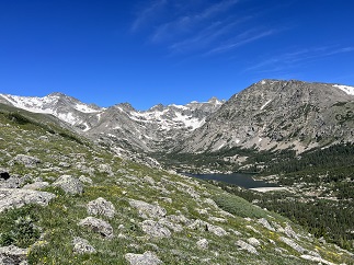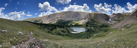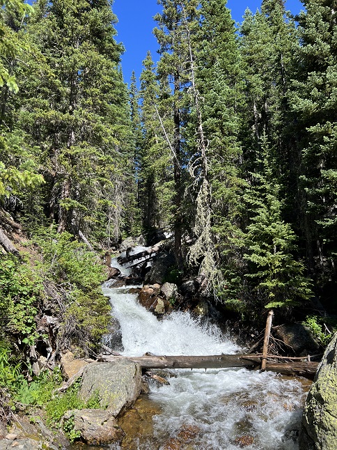 62) Diamond Lake, Indian Peaks Wilderness, 4th of July trailhead, Eldora, CO, July 24, 2023 - We generally avoid hiking in the high country after noon since summer thunderstorms can roll in quickly. However, today the weather looked promising and a mid-week afternoon seemed like a good opportunity to find parking at the extremely popular 4th of July trailhead so we made an exception. We drove up around 2pm and found a parking spot mere feet from the trail. There were some big thunderheads to the north but the sky to the west was clear so we took the risk. It has been many years since we last did the hike to Diamond Lake so it was fun to re-visit it. Since this is in a Wilderness area the trail is just barely developed - a few bridges over the larger creeks and streams - but otherwise it is just a narrow track through the forest. In the places were winter avalanches have knocked down the trees there are hillsides covered with lush wildflowers and the same along the banks of the streams cascading down the steep mountainsides. It was a terrific hike! When we got up to Diamond Lake it was clear that dark clouds were coming over the Continental Divide fast so we made an abrupt turn-around and immediately retraced our route. We stayed ahead of the clouds for the return trip and got back to the car without any drama. A really splendid afternoon in the mountains! A 5.2 mile up and back hike with 1,200 feet of elevation gain.