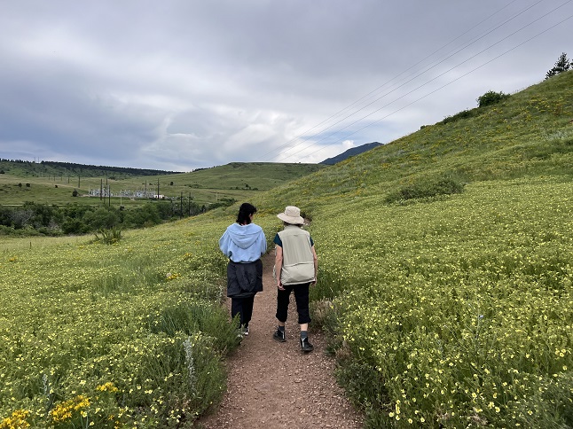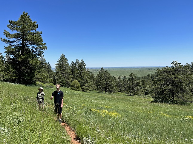 47) Homestead, Shadow Canyon and Mesa Trails, South Mesa Trailhead, Boulder Open Space & Mountain Parks, Boulder, CO, June 9, 2023 - We are back from our trip and immediately back to our weekly hikes with Desiree and Gaelin. We managed to dodge and afternoon rain squall by meeting up late in the afternoon at the South Mesa Trailhead just after a dark storm cloud rolled through. There has been rain most days over the past two weeks and all that moisture has turbocharged the plant grown along the Front Range. The trail seemed almost tropical in places with hip high grass, a colorful tapestry of wildflowers, bushes heavy with berry buds and pine trees loaded with pine cones. Everything was verdant and lush. We did our "long loop" going up Homestead to Mesa, then taking Shadow Canyon trail around the west side before returning via the Mesa and Towhee trails. The variety and sheer quantity of wildflowers was amazing. We were all in positive spirits before the hike and the beautiful landscape just boosted it. A fine way to finish off the week! A 5.8 mile loop with 1,200 feet of elevation gain.