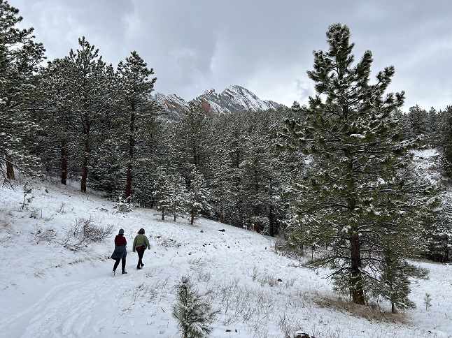8) Chautauqua, Bluebell-Baird, Mesa and Enchanted Mesa Trails, Chautauqua trailhead, City of Boulder Open Space and Mountain Parks, Boulder, CO, January 27, 2023 - Snow and cold weather are on the way so Jonna and Alan met up with Julia down in Boulder to do a little loop in Chautauqua Park while the weather was favorable. We met up at the Chautauqua office on Friday afternoon, strapped on our boot traction cleats and climbed up the hill on the Chautauqua trail towards the first FlatIron. From there we turned south on the Bluebell-Baird trail along the base of the FlatIrons to where it met up with Mesa trail. We dropped down the hill and then looped back to Chautauqua village via the Enchanted Mesa Trail. It was overcast and a little breezy so a little chilly but the conversation was warm so we made it back to the parking lot without feeling too uncomfortable. A 2.8 mile loop with 650 feet of elevation gain.