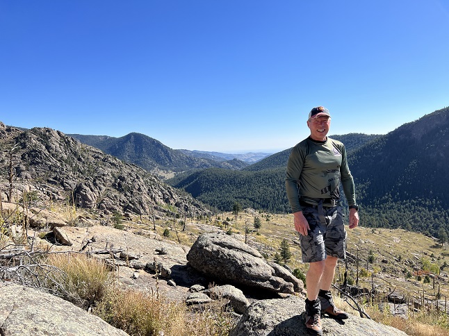77) Kenny Mountain, Big Elk Meadows, Pinewood Springs, CO, September 27, 2023 - Todd and Alan did a hike today that doesn't do justice to the raw stats. The numbers seem easy but the hike was as challenging as it was fun. It has been a few years since we did a true exploration - no trail, no studying topo maps before hand. Just show up in an area, pick a peak off in the distance and an see if we can find a way to get there. In this case, we drove into the Big Elk Meadows area and went to a burn area left over from the 2003 fire. From this vantange point we could see Kenny Mountain and the various peaks on its southern shoulder. We picked out a craggy, rocky point and started climbing... and I do mean climbing. At times we were using hands and feet to scramble up rock faces. It took two and a half hours to get all the way up to destination despite it only being a couple of miles from where we parked the Jeep. It was fun to try to read the terrain, pick out routes to climb up and then to finally reach the goal where we were rewarded with a grand panorama over the entire valley. From there we had a better view to pick out an easier way down but it was still an adventure because of all the downed trees from the fire 20 years ago. We finally got back to the starting point almost four hours after staring out but were both happy with our morning's accomplishment. A four mile loop, mostly going straight up 1,600 feet and then coming right back down.