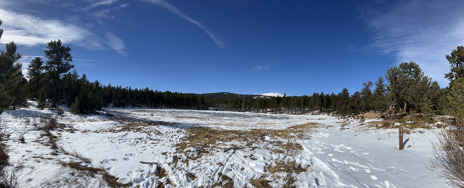 5) Mud Lake, Boulder County Parks & Open Space, Nederland, CO, January 22, 2023 - Jonna and Alan wanted to stretch our legs on a cold but beautifully clear Sunday so we headed over to nearby Mud Lake for a short hike. We did the full Tungsten Loop, the short Kinnickinnick connector trail and the full Kinnickinnick Loop. It isn't particularly long or challenging but it is a lovely area of forest to walk through and the frozen surface of Mud Lake makes for a snow covered meadow mid-winter with snow covered mountains as a scenic backdrop. A 2.2 mile loop with a mild 250 feet of elevation change.