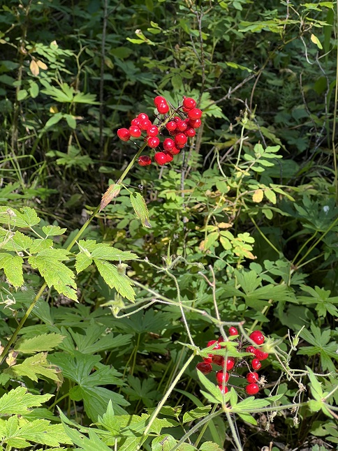 76) Heart Lake, South Boulder Creek Trail No. 900, James Peak Wilderness Area, East Portal Trailhead, Tolland, CO, August 28, 2023 - The weather forecast called for mid-day rain so Jonna and Alan were up early in order to get in a long hike but be down from the high country by the time the storms rolled in. Fortunately, out day went exactly to plan! We headed back to the East Portal Trailhead to give the third of the three hikes accessible from there a try: Heart Lake. This is a longer hike and one that goes right up to the base of the Continental Divide at Roger's Pass. We consciously wanted to pay attention to all the beauty of this trail, especially as the wildflowers of summer have given way to the first signs of Fall. Rather than colorful blossoms the highlights of the trail were bushes loaded with wild raspberries, tiny little wild strawberries, a variety of different mushrooms, shrubs weighed down with red, orange and purple berries, wild onions and a dozen different species of native grasses all bent over with dry seeds. An overnight rain and swelled South Boulder Creek into a raging torrent and rejuvenated countless small streams that trickled down the valley sides. The wet summer boosted bright green moss and lichens which hung from the trees and covered the rocky trail. We made it up to Roger's Pass Lake before noon and had a glorious time hiking through the alpine tundra in massive bowl surrounding Heart Lake. However, tall thunderheads were visible to the west so we kept our sightseeing quick and headed back down. The clouds move fast up high and a rain squall caught up to us about 1/3 of the way back down. We put on our rain gear and kept hiking but 20 minutes later it had passed so we could peel the rain jackets back off for the rest of the hike. This has long been a favorite hike but it has been quite a few years since we made the long trek up to Heart Lake so it was particularly rewarding to enjoy such a beautiful place once again. A 9.3 mile up and back with 2,200 feet of elevation gain.