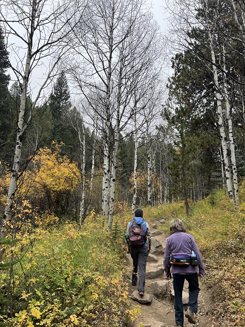 81) Ralston Roost, Horseshoe Trail and Black Bear Trail, Golden Gate Canyon State Park, Golden, CO, October 6, 2023 - Another Friday hike but this time we had the treat of joining our friend Marni and her pup Daisy on a trip to enjoy the last of the Fall colors in Golden Gate Canyon State Park. We did the Ralston Roost hike that Jonna and I have done many times but we mixed it up by doing the loop in reverse from the route we have traditionally done. This meant a more gradual climb up Horseshoe Trail but then a steep decent on Black Bear Trail. At the mid-way point we added a side trip into Frazier Meadows where the Fall colors were particularly striking. In addition to all the autumnal leaves we also had a proper Fall atmosphere due to low-lying clouds providing fog at the higher elevations and bringing a crisp, biting chill to the air. It was a perfect October hike, a great opportunity to spend time with our friend and it inspired us, when we got back home, to fire up the wood stove for the first time this Fall. A 6.3 mile loop with 1,300 feet of elevation gain.
