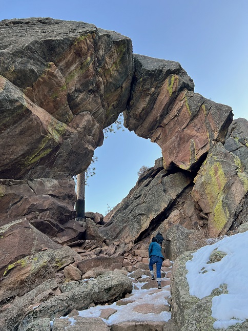 13) Royal Arch, Chautauqua Park, City Of Boulder Parks and Recreation, Boulder, CO, February 12, 2023 - It has been seven years since any of us last hiked the Royal Arch trail down in Boulder so with some big sports ball event occupying most of the US Desiree, Jonna and Alan decided it was a good time to re-visit it. (We'd tried to hike it a couple of times in 2022 but the trail was closed so this was also the first time in awhile that we even had the option so it was nice to get reacquainted with an old trail friend.) We all met up in the Chautauqua parking lot in the afternoon just as the mid-day hikers were bee-lining it for home to plug into their TVs. There were still a few folks out on the trails but compared to a normal weekend it was positively deserted. What was on the trail was ice. There were a few sections that resembled a natural bobsled run and it was tricky both going up and coming back down. Jonna and Alan had our traction cleats but Desiree left hers in the car. I think this trail may have made her a believer in the magic power of these little strap on boot cleats! Despite the challenging trail conditions the view from Royal Arch down over south Boulder, Superior and Westminster was worth it. We took it slow going back down and made it without injury so the hike was a success in multiple ways! 4 miles to the Arch and back (which includes hiking to my far distance parking spot!) with 1,400 feet of elevation gain.