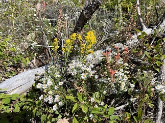 75) Homestead, Shadow Canyon Spur and Mesa Trails, South Mesa Trailhead, Boulder Open Space & Mountain Parks, Boulder, CO, September 24, 2023 - We got together with our friend Desiree for another Sunday evening hike but this one had the added importance of being a pre-birthday outing for Desiree so we made it a shorter hike so we had time for a nice celebratory dinner afterwards. However, we still did the "middle" loop of the three we've made standard hikes from the South Mesa Trailhead. The birthday surprise was finding fields of late summer wildflowers still blooming in the shady areas around the trail - tiny little white and yellow daisies and bright purple flax. This was contrasted with the yellow and red leaves starting to dominate the ground cover and the tall stalks of brown grass with light tan seeds waving in the intermittent breeze. The sun is starting to set earlier and earlier so the sun dipped behind the Front Range peaks while we hiked which provided some nice lighting as beams of light speared between the mountains. A pleasant loop and a fun way to help Desiree celebrate another year! A 4.5 mile loop with 1,000 feet of elevation gain.