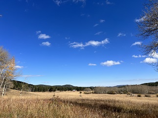 84) Caribou Ranch Open Space, Boulder County Open Space Parks, Nederland, CO, October 13, 2023 - With family arriving on Friday afternoon we didn't have a full day available hiking but we still got out to do one of our local loops. A cold front rolled through mid-week and the weather on Friday was still pretty cool despite it being a beautiful sunny day. Alan wasn't paying attention and wore a short sleeve t-shirt for the hike which resulted in us speed walking the trail trying to generate some body heat! The Caribou Ranch Open Space is always a great place to enjoy mountain scenery and Fall is a perfect time to hike there. The old meadows of the DeLonde Ranch are filled with dry grass and edged with colorful wild rose bushes and bone white aspens. A lovely, if chilly, hike right in our town's backyard. A 4.2 mile loop with 250 feet of elevation gain.