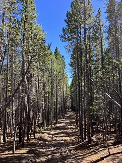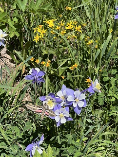 49) Cascade Falls, Continental Divide National Scenic Trail, North Inlet Trailhead, Rocky Mountain National Park, Grand Lake, CO, June 16, 2023 - With the weather forecast once again calling for afternoon rainstorms Jonna and Alan got up early in order to get in another morning hike in order to beat the weather. The weather app said the rain would roll in later on west side of the Continental Divide so we made the trek over Trail Ridge Road in Rocky Mountain National Park to Grand Lake. There we found the North Inlet Trailhead and a section of the Continental Divide National Scenic Trail going north into the National Park past Cascade Falls. This area was badly burned by the East Troublesome fire in 2020 and the entire area is covered with thousands of burned tree trunks. However, the lack of tree cover means rain and sunshine reaches the ground and the result is an amazing display of wildflowers, both in variety and quantity. It was neat to steadily gain elevation and watch the types of wildflowers change as we went up. Near the trailhead there were loads of Tall Chiming-bells. Then, it shifted to Purple-Fringe. Next were Columbines, Snow Buttercups and Golden Banner. Near the top of the hike there were Wild Roses and Shooting Stars. However, throughout it all were the bright yellow Heartleaf Arnica flowers. Entire hillsides just glowed yellow with all the Arnica blooming. It was a stark contrast to see the devastation of the blackened tree trunks surrounded by the vibrant flowers. The trail made a steady but mild climb up to Cascade Falls where North Inlet Creek cascades down about 50 feet through huge granite boulders. We had planned to eat a snack while enjoying the view from the top but clouds of mosquitos convinced us to make a quick retreat. The return was pleasant and we spotted a few critters on our way back down. We got back to the trailhead by noon, beating the rain, and grabbed lunch in Grand Lake before driving back over Trail Ridge Road through rain, hail and fog. A 7.2 mile out-and-back with a surprisingly mellow 600 feet of elevation gain.