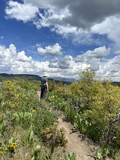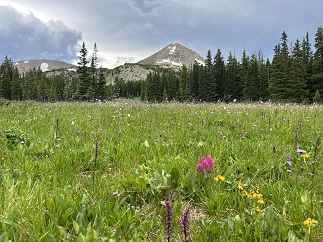 46) Coyote Hill Loop #314 Trail, Pagosa Ranger District, Pagosa Springs, Colorado, June 6, 2023 - What is probably the last hike of our Four Corners trip was a nice one. We spent the morning doing a 3 hour guided tour a Chimney Rock National Monument but during all the time we spent on that (very good) tour we actually only walked about a mile. So after having a picnic lunch near the Chimney Rock visitor center we drove to a trail system that is northwest of Pagosa Springs to do one of the hikes there. We chose the Coyote Hill Loop trail and it was a great pick. This trail is at a higher elevation than we've been previously on this trip and the alpine wildflowers were in full bloom. There were purple, pink, yellow and white flowers carpeting the hillsides and the marshy low points were filled with big patches of purple irises. The San Juan mountains and Pagosa Peak were prominent features on the horizon. We had sunshine and warm temperatures but dark clouds were forming as we hiked and rain was forecast for the evening so we were lucky to have such perfect hiking weather. A fine way to finish off our two weeks of hiking while on the road! 3.5 mile loop with 450 feet of elevation gain.
