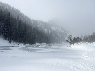 12) Dream Lake, Bear Lake trailhead, Rocky Mountain National Park, Estes Park, CO, February 6, 2023 - Another energetic day with Jamie visiting! Today we woke up early, dusted off our snowshoes and headed up into Rocky Mountain National Park to find some deep snow. We got to the Bear Lake parking area early (there were only about a dozen cars there...I've never seen it that empty before!) and, after a quick side trip to see frozen over Bear Lake, we headed up the trail to Nymph Lake. This section of trail was packed down enough we didn't need the snow shoes but after we crossed Nymph Lake we strapped them on. We also got a little lost since the trail from Nymph Like to Dream Lake was covered with blown snow but with the help of the GPS we eventually found the right route. We broke trail the whole way from Nymph to Dream going over a 10,000 foot ridge. Once we dropped down to Dream Lake we were at the east end of a valley and the wind (and snow) were howling down off the Continental Divide. We all agreed that going the additional half mile to Emerald Lake straight into that spray of ice just wasn't worth the discomfort so we turned back and returned to Bear Lake. However, after putting the snowshoes back in the car we did post-hole our way all the way around Bear Lake just to add a little more trekking to our day out in RMNP. A gorgeous morning spent in a pristine winter wonderland. A meandering 3.7 mile loop with 750 feet of elevation gain.