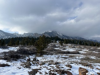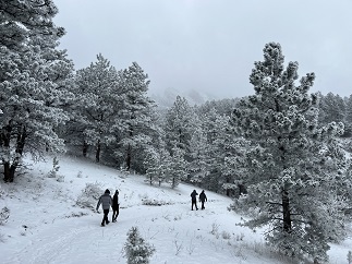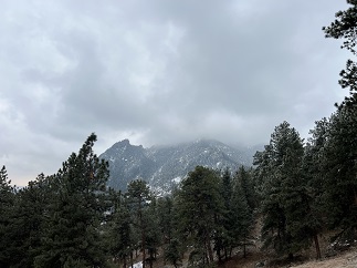 23) Homestead, Shadow Canyon Spur and Mesa Trails, South Mesa Trailhead, Boulder Open Space & Mountain Parks, Boulder, CO, March 27, 2023 - An overnight storm dropped a couple of inches of fresh snow along the Front Range but that didn't dissuade us from joining Desiree for a mid-day hike at the South Mesa Trailhead. Fortunately, the sun was trying to break through the low-lying clouds which pushed the temperature up enough to start melting some of the snow and kept it from being too cold to enjoy. The Flat Irons looked gorgeous with a layer of snow on them and the pine trees were equally pretty dusted with white. We opted to hike the medium version of the loops we do from this trailhead - hiking up the Homestead Trail, switching to the Shadow Canyon Spur trail and taking that over to Mesa Trail, which we then took back to the trailhead. Another nice afternoon hike. A 4.5 mile loop with 1,000 feet of elevation gain.