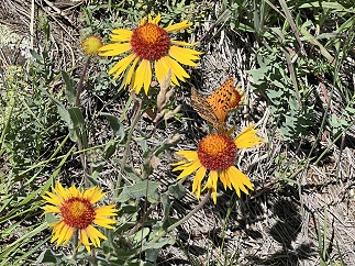 50) Homestead, Shadow Canyon Spur and Mesa Trails, South Mesa Trailhead, Boulder Open Space & Mountain Parks, Boulder, CO, June 19, 2023 - All our recent hikes have been highlighted by the copious numbers of wildflowers that are blooming this summer. In an effort to continue that trend we returned to our "regular" weekly hike to see what new flowers are opening there just ten days after our previous visit. Desiree, our normal hiking partner, was busy but her son Gaelin was free and joined us for the hike. We started at our usual South Mesa Trailhead and immediately found that thousands of yellow Cinquefoils had popped open in the fields at the lower elevations. However, the variety of wildflowers was impressive as well with Penstemon, Flax, Alpine Daisies and Thistle covering the blue/violet portion of the color palette. Mariposa Lilies, Yarrow, Cow Parsnip, Trailing Daisies, Alpine Phlox and the spectacular Crested Prickly Poppies added white to the mix. Finally, Globemallows, Dandelions, Blanketflower and Buttercups helped the Cinquefoils with the yellows. With the prolific blossoms there were frisky butterflies, bees, beetles and flies all jumping from flower to flower. Gaelin even spotted a baby bunny rabbit in some bushes at one point so we were veering pretty close to an idealized Disney landscape territory... These flowers won't stick around long though because the temperature was pushing 90 degrees and after weeks of rainy weather the switch to baking sunshine will wilt them quickly so we were happy we got to enjoy them on our hike. A 4.5 mile loop with 1,000 feet of elevation gain.