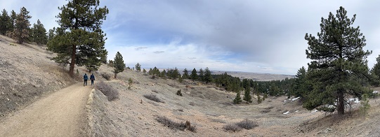 28) Hurricane Hill trail, Nederland, CO & Homestead, Shadow Canyon cutoff and Mesa Trails, South Mesa Trailhead, Boulder Open Space & Mountain Parks, Boulder, CO, April 16, 2023 - How about two hikes in one day! In the morning we did a hike from the house with Julia where we did most of the loop around Hurricane Hill. The trail was covered in snow from a storm two days ago so we were slipping and sliding on snow covered ice for most of the trail. In the afternoon we drove down to Boulder for our weekly hike with Desiree. This time we did the "medium" loop since everyone was feeling a little low energy. The Homestead/Mesa/Shadow Canyon cut-off trails were all completely dry and the early evening sun kept the temperature warm Two different hikes on two different trails and with two different hiking partners. A great way to spend a day. Combined we hiked 8 miles with a combined 1,000 feet of elevation gain.
