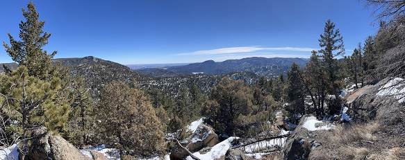19) Realization Point, Flagstaff Mountian, Chapman Drive/Rangeview/ Tenderfoot Trails, City of Boulder Open Space and Mountain Parks, Boulder, CO, March 15, 2023 - Todd, Rusty-pup, Jonna and Alan all met up for an evening hike at the base of Boulder Canyon. The Chapman Drive "trail" is really an old road build by the CCC (Civilian Conservation Corps) back in the 1930s but it has been closed off to vehicles so it is a quick and easy way up for hikes and bicyclists to go up the back side of Flagstaff Mountain. Since sunlight can reach the road-wide trail most of the snow/ice had melted off but there were still a few slushy/icy spots where trees shielded the trail. Once we got up to the top and switched to the Rangeview trail the namesake panorama of the snow-covered Continental Divide was terrific. As we took the Tenderfoot trail back down to Chapman Drive for the return to the trailhead the evening "Golden Light" was lighting up the pine trees. A great little loop and a chance for Todd and Jonna to catch-up since we haven't all hiked together in about year. A 5.1 mile hike with 950 feet of elevation gain.