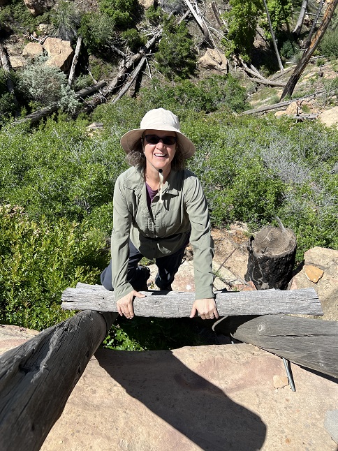 45) Point Lookout Trail, Mesa Verde National Park, Mancos, Colorado, June 4, 2023 - After so many days of back-to-back hiking we woke up tires and strugglingfor motivation but after finding a coffee shop where we could buy some caffeine we managed to find energy to do another hike, albeit a short one. We drove into nearby Mesa Verde National Park and headed for the campground where the Point Lookout trail climbs up a towering knife ridge called, naturally Point Lookout. The trail has over two dozen switchbacks as it goes western face of the ridge and then levels off on top to go all the way to the north end where there is a near 360 degree panorama looking across Mancos valley to the San Juan and La Plata Mountains. We stood on the edge of a 600 foot high ledge and basked in the expansive view. It was a short (but steep!) hike that normally wouldn't make the hiking page but given our lack of motivation in the morning we thought it was an decent accomplishment for the day. A 2.2 mile up and back down trail with 550 feet of elevation gain.