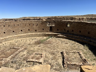 40) South Mesa Trail, Chaco Canyon National Historical Park, Pueblo Pintado, New Mexico, May 30, 2023 - After loving the Pueblo Alto trail hike the previous day we decided to get up early on our second day to try a second loop in the park - The South Mesa trail. This one started at the Casa Rinconada ruins before climbing up the southern rim of Chaco Canyon to go across the top of South Mesa to the Tsin Kletzin ruins. From there the trail loops back to the northwest before dropping down into a side canyon before circling back east to the trailhead. The landscape on top of South Mesa was drier but still covered with wildflowers. The Tsin Kletzin site was unexcavated but the mound covering most of the site provided a nice panorama including loop north across Chaco Canyon to the north rim. The hike ended with Casa Rinconada - the Great Kiva which is an impressive site. Not as amazing a hike as the Pueblo Alto hike but it was still a good way to see more of Chaco Canyon. A 4.6 mile loop with 500 feet of elevation gain.