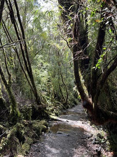93) Coastal Path, Parque Nacional Tierra Del Fuego, Ushuaia, Argentina, November 19, 2023 - The final hike of our Patagonia adventure was part of a guided group hike in Tierra Del Fuego National Park. We did a river rafting/float in the morning and then, after lunch, were dropped off along Ruta 3 for the hike. There were twelve of us hiking plus our guide Sebastian. The full Coastal Path trail runs 9.5 miles in length, which would have been fine with me, but this was not a group of regular hikers. So the reason we were dropped off along Route 3 was to hike out to the shore of Lapataia Bay and pick up the trail at approximately the halfway point. We then turned east and hiked to end of the trail at Bahia Ensenada Zaratiegui. This trail is through the sub-Antarctic forest - unique zone found only for a few miles on Tierra Del Fuego sandwiched between the 3,000 foot snow-covered peaks of the Andes Mountains and the ferocious sea of the Drake Passage to the south. Only four types of tree exist in this landscape and all are different species of the Nothofagus tree. The ground is very marshy and cold all year round so trees have shallow roots and grow slowly. Dead and down trees also decay very slowly - the guide pointed out stumps of trees cut when the park was created 70 years ago which have degraded very little. There are also practically no native land animals in this harsh environment so the wildlife is all birds and sea animals. The trail itself was very muddy but every half mile or so it would pop out onto a pebble beach. In these viewpoints the majesty of the landscape was apparent with dramatic mountain peaks all around. The guide, Jonna, Jamie, a lady from Buenos Aires and I all had a much faster hiking pace than the others so we had to slow down and take stops in order to keep the group together. If only we could have hiked by ourselves we could have done the whole trail. Argh! We encountered an intermittent stream of hikers doing the trail in the opposite direction but also had stretches where it was just us and the forest. The temperature warmed gradually throughout the afternoon - from a cold and humid mid-30s when we started to a partly sunny but still chilly low 40s. As long as we were moving I was warm and actually removed layers during the hike which was the opposite of most of our activities in Ushuaia where we just kept adding (or wishing we could add!) layers. It was a very scenic hike and as a nature stroll it was excellent. However, it reminded me that guided group hikes aren't my preferred way to enjoy the outdoors. A 4.3 mile one-way hike with a rolling 400 feet of elevation gain.