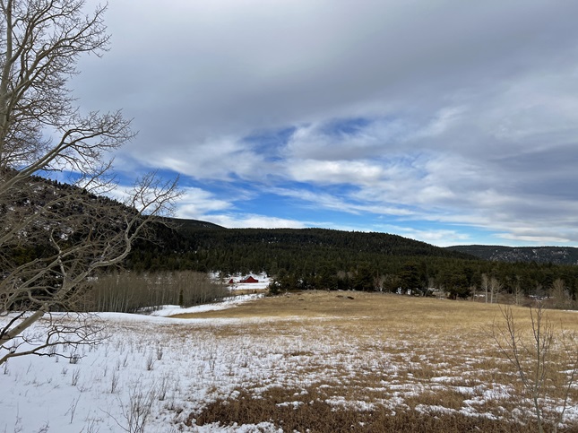 5) Caribou Ranch Open Space, Boulder County Open Space Parks, Nederland, CO, January 31, 2024 - Friends Kristin and Steve made the drive up into the mountains for a social visit and after catching up we headed over to Caribou Ranch Open Space to get in some exercise. The trail was mostly packed snow but micro-spikes and hiking poles made it an easy hike. We had blue sky to the east and clouds to the west with our trail right on the dividing line. When a breeze would pick up, the temperature seemed to drop about 10 degrees so we were thankful every time some sunshine peeked through. A relaxed hike we were happy to share with our long time friends. A 2.5 mile hike with 100 feet of elevation gain.