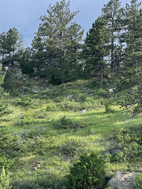 42) Mesa and Homestead Trails, South Mesa Trailhead, Boulder Open Space & Mountain Parks, Boulder, CO, August 25, 2024 - This was Alan's first hike after his motorcycle accident and it was a bit of an eye-opener. Alan and Jonna met up with Desiree at our usual spot - the South Mesa Trailhead. The sky was dark and seemed to be threatening to rain at any moment but we decided to head out anyway with the goal of hiking the "short" loop. Unfortunately, the body movement of hiking on a trail with all the small impacts going up and down rocks caused more soreness than anticipated for Alan so we ended up turning back before we got to the point where the Homestead Trail meets up with the Mesa trail. We got a few light sprinkles on the way back but fortunately the clouds held off from dumping on us. Despite the abbreviated hike it was still nice for Alan to get in some physical activity and we all enjoyed seeing a few critters - A big bull elk and then later two spotted mule deer fawns. We also had time to catch up with Desiree to hear about her recent trip so all-in-all it was a successful outing even if it was a big shorter than planned. A quick 2.2 mile out and back with a mild 350 feet of elevation gain.