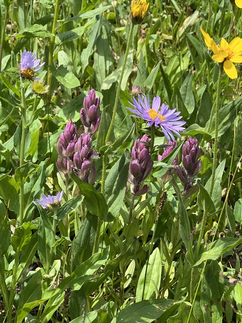 34) Ellsworth Creek trail system, Rollinsville, CO, July 4, 2024 - We enjoyed the wildflowers at Ellsworth Creek so much yesterday we did it again today. Our friends Desiree and Gaelin came up from Boulder for an afternoon hike and we were once again lucky to have the trail to ourselves. In addition to hiking the loop we did yesterday we also made the climb up to the old Ellis Lode Mine and took a look at the meadow just above it. We had a beautiful blue sky filled with white puffy clouds that contrasted nicely with the green field of colorful wildflowers. I'll always prefer the brightly colored bunches of blossums exploding in a field of green over fireworks to celebrate the 4th of July! A 3.9 mile out-and-back with 900 feet of elevation gain.