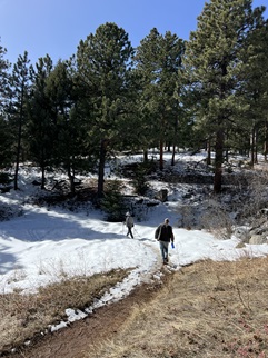 11) Divide Overlook, Chapman Drive/Tenderfoot Trails, City of Boulder Open Space and Mountain Parks, Boulder, CO, March 2, 2024 - The odds were against hiking this weekend but things came together at the last moment to get us back out on the local trails. This weekend is "Mom's weekend" at CU and our cousin Chi who is a student had invited Jonna to be her stand-in mom for the weekend since my cousin Michelle couldn't make the trip out. However, the event they'd planned to attend together fell through so Chi invited Alan to join she and Jonna for a hike instead. Alan had spent the past weekend laid flat by a cold (multiple home COVID tests came back negative) but had just enough energy to try a hike. We chose the Chapman Drive hike - the trail isn't too challenging but it still provides some beautiful panoramic views of the Continental Divide. We picked Chi up from her dorm just after lunch and drove to the Chapman Drive trailhead. From there we made the climb up to Realization Point just below the top of Flagstaff Mountain. In a few spots on the north side of the mountain there were patches of ice but temperatures in the mid-60s meant it was melting fast so we encountered everything from dry trail to slushy-mushy goop to thick ice. The gorgeous weather meant we got a nice view of the big mountains from a few different spots. More importantly, we all got to enjoy spending some time (and soaking up some vitamin D!) together. A 5.1 mile loop with 950 feet of elevation gain.