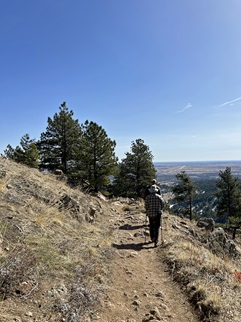64) Chapman Drive, City of Boulder Open Space and Mountain Parks, Boulder, CO, December 30, 2024 - Our last hike of the year wasn't a big one but it shows we are ending the year healthy enough to still get out to enjoy the beautiful outdoors. Alan's broken ribs and Jonna's broken foot are both on the mend. We were going to hike down in Boulder but it was crazy windy so we drove a little ways back up the canyon to hike the Chapman Drive trail. It is protected from the wind by the foothills but still open enough to get some mid-day sun. We climbed halfway up Flagstaff mountain and were thankful to find the trail dry and clear. At the halfway point we turned back not wanting to stress Jonna's foot too much on our first hike in the three weeks since she injured it. Nothing fancy but we were glad to end the year with another hike. A 2.5 mile out-and-back with 550 feet of elevation gain.