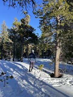 6) Sourdough Trail, Brainard Gateway Trailhead, Brainard Lake Recreation Area, Ward, CO, February 5, 2024 - We finally got some fresh snow so we invited Gaelin to join us for a snow shoe up at Brainard Lake Recreation Area. We parked in the Gateway Trailhead lot and then headed north on the Sourdough trail (#835). The trail dropped down into South St. Vrain Creek valley where the combination of recent snow, a northfacing trail and cold temperatures meant we had snow everwhere! It was a little winter wonderland. Because we got a late start we opted not to do one of the longer loops in the park but we did made a short out-and-back on the South St. Vrain Trail (#909) before climbing back up Sourdough to return to the parking lot. Gaelin will be moving away soon so we particularly treasured getting to spend an afternoon hearing all about his new job. We'll miss hiking with him on Sundays this Spring/Summer! A 3 mile out-and-back with 550 feet of elevation gain.