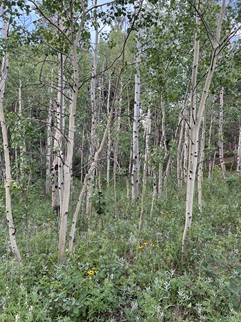 40) Gould Loop Trail, State Forest State Park, Gould, CO, August 6, 2024 - After our terrific alpine hike the previous day we decided to do something different for our second day of camping at State Forest State Park. The south fork of the Michigan River flows through the campground area and the Gould Loop Trail runs alongside it all the way to the State Park Visitor Center. This provided the possibility of spotting a moose so we decided to give it a try. Unfortunately, the exceedingly hot weather meant it was well into the 80s when we started the hike mid-morning and that probably doomed our moose spotting as they were probably bedded down in the shade to avoid the heat. That wasn't a bad idea for people too but we soldiered on despite most of the trail running through areas that had been cleared of trees subjecting us to direct sun for much of the hike to the Visitor Center. We spent some time using the Visitor Center wifi and then started back. For the return we crossed over the river and hiked back along the river along the southern side. The trail there was slightly higher up above the river valley and more of it was in forest so we got some shade from the afternoon sun. We spotted a hawk up in a dead tree and about a thousand grasshoppers but I think all the sensible critters opted to lay low and try to stay cool. A 6.3 mile loop with a mellow 200 feet of elevation gain.