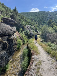 26) Caniça Route (PR10 SEI), Praia Fluvial (River Beach) trailhead, Lapa Dos Dinheiros, Portugal, June 3, 2024 - After skipping our second hike yesterday we decided to squeeze in one in the morning before we left the mountains behind and returned to the coast. In the next town over from where our hotel was located was a hiking trail that had been recommended by two different people so the combination of high regard and close proximity made that our goal for the morning. We drove up to Lapa Dos Dinheiros and found the trailhead next to Praia Fluvial (River Beach). The trail ended up being pretty strenuous - lots of elevation change all throughout the hike - and the scenery also varied greatly. There were portions where the trail used old dirt roads and most of these areas were kind of boring. However, there were some sections that were fantastic. About a quarter of the trail ran alongside an old irrigation ditch - I’d guess multiple hundreds of years old - which had an amazing variety of wildflowers along it. At the head of the irrigation ditch was a perfect swimming hole surrounded by gorgeous moss covered rocks. Another section contained a little hidden grotto that was straight out of a 17th century mythological painting with moss covered trees, a perfect trickle of a waterfall and a crystal clear pool of water. It was just missing a satyr or faerie to be complete. The quality of the trail was also highly variable with the section along the canal being perfect while some other places were overgrown with head-high grass or ferns. There was one short section that was full on rock climbing. Anyway, it was an adventure and I am glad we got a chance to hike again before going to a big city for our last few days in Portugal. A 4.4 mile loop with 1,200 feet of elevation gain.