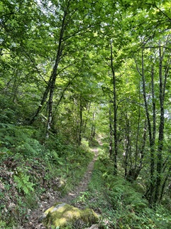 24) Rio Alva Trail, Vila Cova à Coelheira, Portugal, June 1, 2024 - We had such an incredible experience with an after dinner hike the previous day we decided to do it again. After arriving at our adorable hotel in the tiny village of Vila Cova à Coelheira we followed our host's advice and did a 2 mile loop along the river behind the hotel. The trail followed the Alva River but on a ledge about 20 feet above the water. This area wasn't quite as lush but will still a rich forest filled with Oak, Chestnut and Cork trees. Add in the ferns and moss and wildflowers and it was a natural botanic garden. The crunch of the dry leaves, the trickle of the river current and the twittering of the birds made it a sublime and peaceful place. Moreso, since we had the entire trail to ourselves. A 2 mile loop with a basically flat 70 feet of elevation gain.