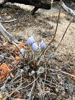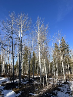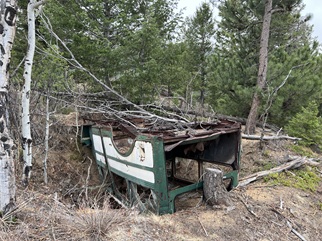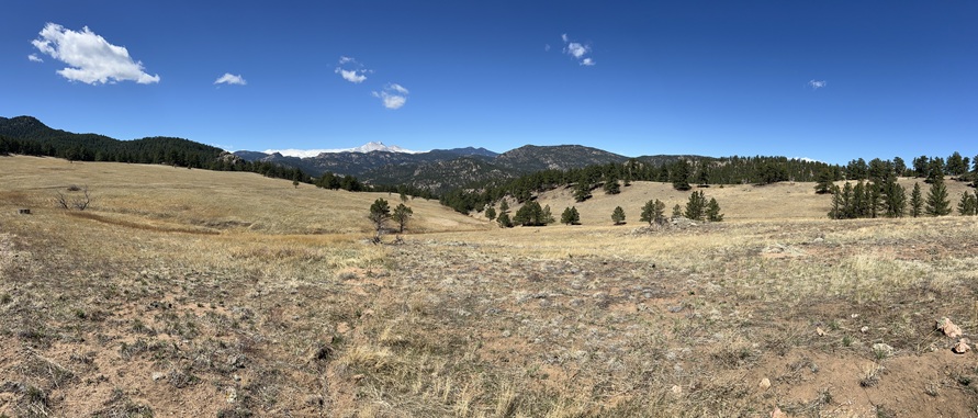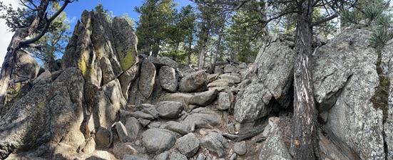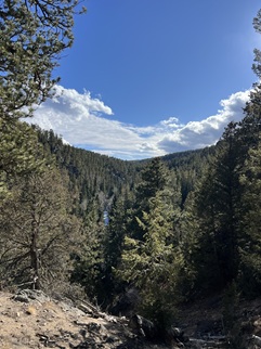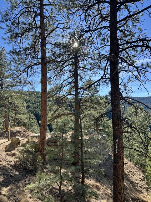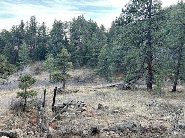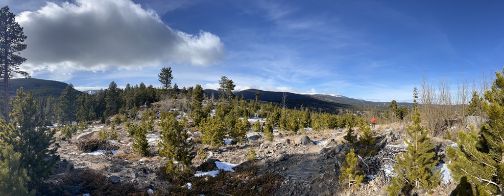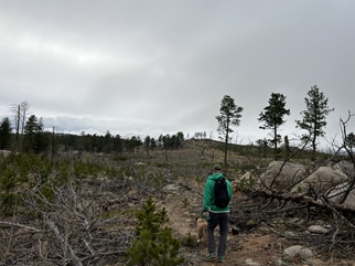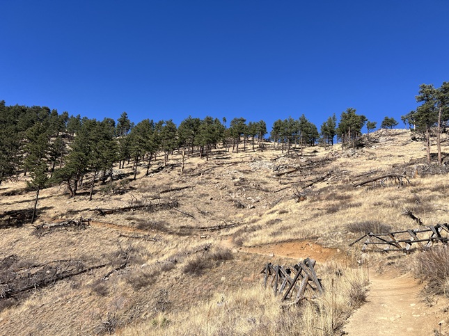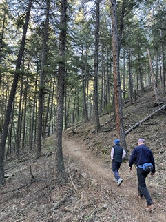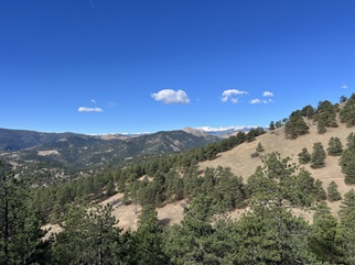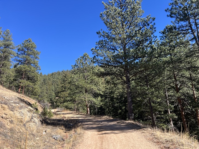 25) Vasco Mine #10 and Ridge Road Trails, Nederland, CO, March 31, 2026 - We have been talking with our friend and neighbor(-ish) Kipp for about a month about getting together one evening to hike one of our local unofficial trails. Finally, on a Tuesday evening, Kipp and Alan made it happen. Alan hiked from home along the Vasco Mine #10 trail towards where Kipp lives. Kipp and his dog Choogie met up with Alan on the trail and we continued going east along the trail. However, we weren't alone. Our warm, dry winter has resulted in an explosion of ticks in our area and we were encountering them as we hiked. We were stopping about every 50 feet to flick ticks off our pants and stopping every quarter mile to dig through Choogie's fur to pull ticks off the pup. We could see ticks lined up on the dry stalks of grass alongside the trail - sometimes two or three ticks to a blade of grass. It was shocking! Fortunately, once we got to the end of the Vasco Mine #10 trail we crossed Ridge Road and moved onto the Ridge Road trail system which is a mix of 4x4 roads and wide single track trails. It also goes through the burn area so more open with fewer trees, less underbrush and less grass. We still picked up a few ticks hiking through this area but we weren't having to stop every 20 steps to deal with them. The sun set while we were hiking and the temperature cooled down but we managed to complete most of the loop we'd planned so it was a successful get together! A 3.5 mile loop with 475 feet of elevation gain.