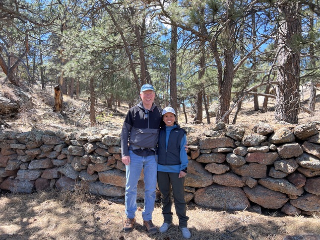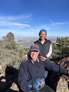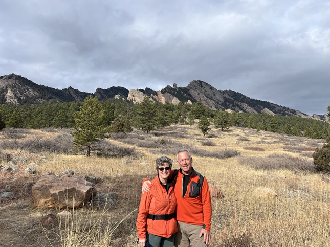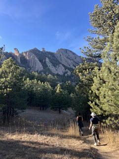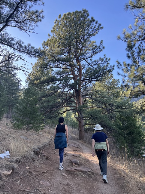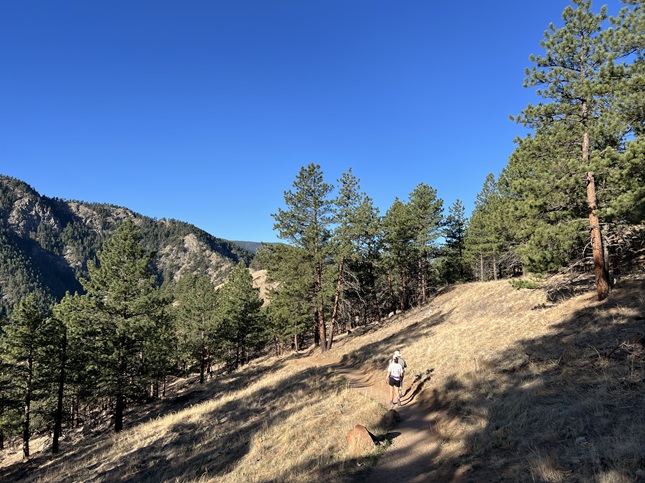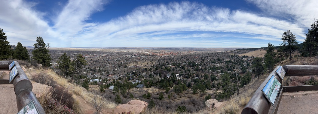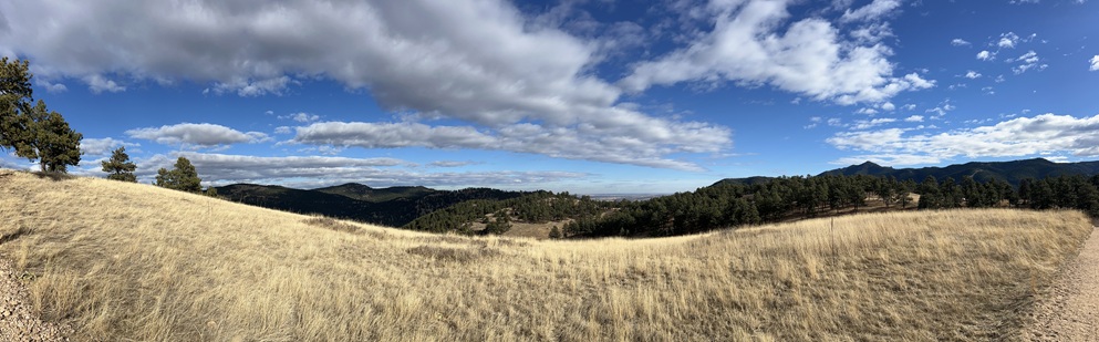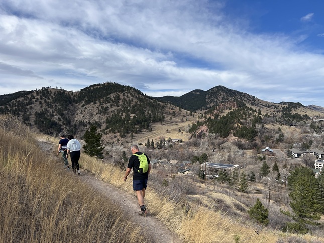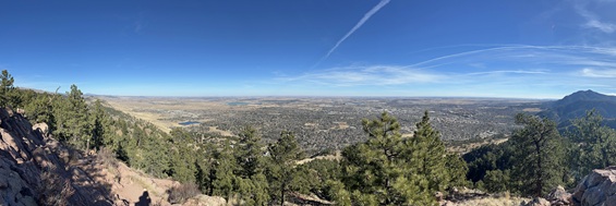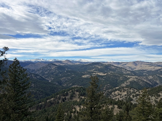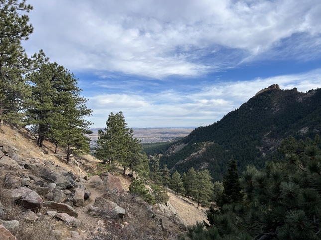 24) Green Mountain, Boulder County Open Space & Mountain Parks, Boulder, CO, March 29, 2026 - Another Sunday evening hike with our friend Desiree but we decided to try a different trail. I can't believe I'm saying this in March but we headed up into the front range mountains to find some cool air since the temperature was up into the 80s in Boulder. We drove up to the top of Flagstaff Mountain and then headed over to Green Mountain. However, we were all feeling pretty tired (Alan had spent the day felling and bucking trees!) and ended up running out of steam before making it to the top of Green. Despite turning around early we got to enjoy some nice views looking north along the Front Range with the long shadows being cast across Boulder from the setting sun in the west. A 3.3 mile up and back hike with 850 feet of elevation gain.