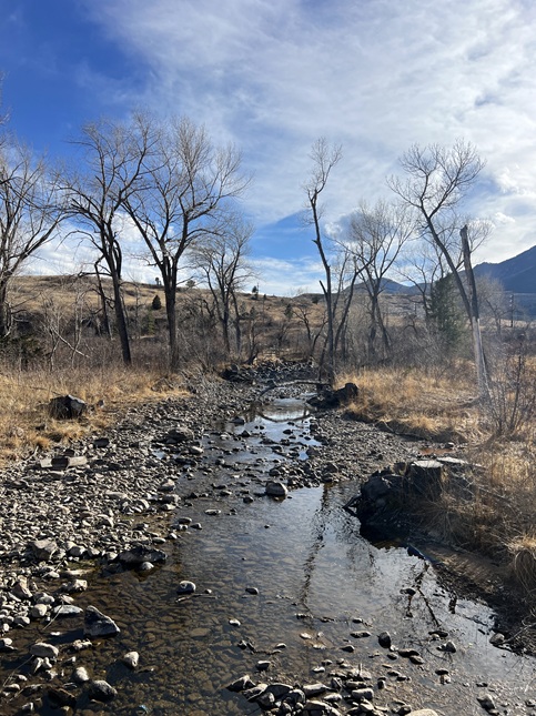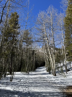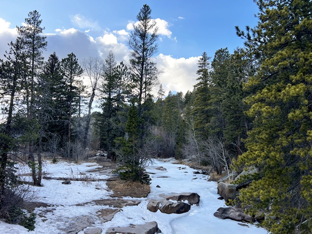 9) Ceran St. Vrain Trail, Boulder City Open Space & Mountain Parks, Boulder, CO, February 7, 2026 - On a warm winter Saturday afternoon we got a call from our friend Holly asking if we wanted to go for a hike so we threw on hiking clothes and headed north to the Ceran St. Vrain trailhead to meet up with Holly, her partner Rick and their pup Mikyo. Like so many of our trails all the warm weather has mostly melted out the Ceran St. Vrain trail even though it is deep down in a creek valley. There were a few stream crossings that were iced over and a few spots where residual packed snow was still on the trail but mud was as big a problem as snow. The other thing that was obvious since the last time we've hiked this trail is that the recent windstorms have brought down a lot of trees. In some of the forested areas there were dozens of trees blown down along with many stumps and bare trunks. All that dry wood on the ground was just another reason to have us doing a snow dance... A 4.2 mile out-and-back hike with a mellow 400 feet of elevation gain.