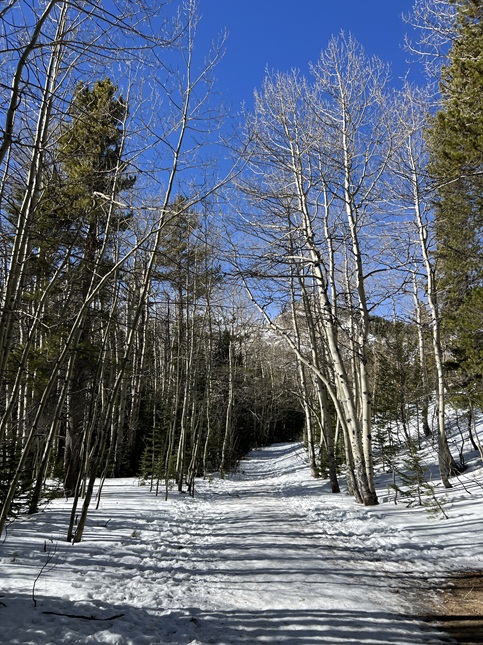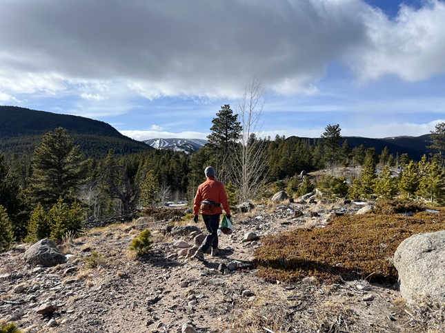 5) Lookout, Hobbit 4, Hobbit 3 and Observatory Trails, West Magnolia trail system, Nederland, CO, January 30, 2026 - Jonna and Alan took a break from tasks around the house for a quick Friday afternoon. We headed to the nearby West Magnolia trail system where we started from the Lookout Trail trailhead. After hiking up to the lookout we discovered a new trail, named Hobbit 4, had been built that circled around the YMCA camp and then connected to the old Hobbit 3 trail just south of the West Mag campground. Made a loop by connecting the Lookout, Hobbit 4, Hobbit 3 and Observatory trails. Despite a few small snow falls the warm, sunny weather has melted out most of the snow so at most we only had to deal with ankle deep snow in the forests but hiked on dry trail in the more open areas. We did pick up some trash along the way so the lack of snow at least allowed us to do a little clean-up in the campground area. A 3 mile loop with 400 feet of elevation gain.