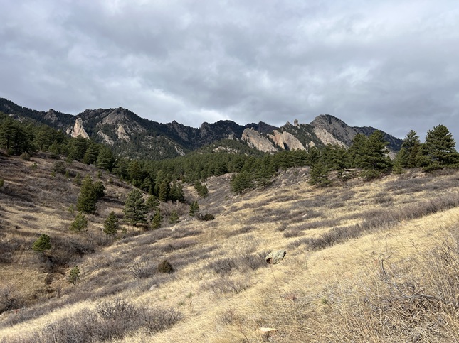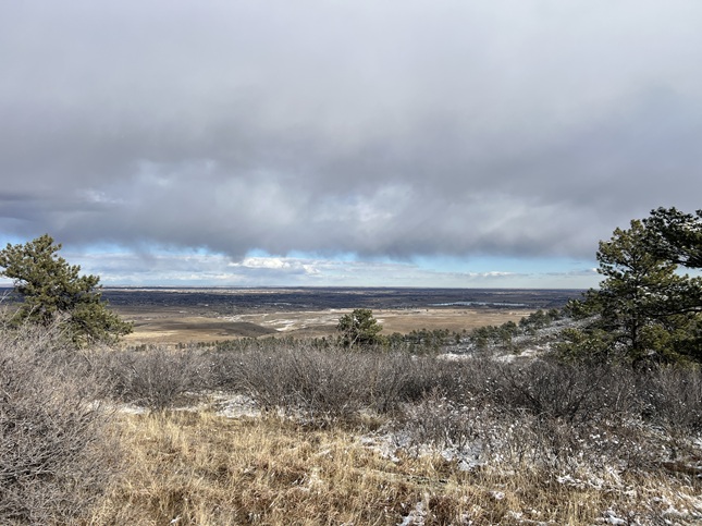 12) Homestead, Mesa and Towhee Trails, South Mesa Trailhead, Boulder Open Space & Mountain Parks, Boulder, CO, February 10, 2026 - For the third day of Jamie's visit we headed out for yet another hike but we were starting to feel the effect of back-to-back hikes so we made this one a shorter one. We've told Jamie about our regular hikes with our friend Desiree so we brought him to hike our "short" loop from the South Mesa Trailhead. There was a big bank of clouds over the front range with rain in the forecast for noon but the morning sun was coming in at a low enough angle to shine on the trails. We started on the Mesa Trail, then turned onto the Homestead Trail for the climb up the hillside, then we turned back on Mesa for a short distance before turning onto the Towhee Trail for the return to the trailhead. As we got back to the car dark clouds blocked out the sun and the temperature dropped to below freezing so we felt we'd timed it perfectly. A 3 mile loop with 500 feet of elevation gain.