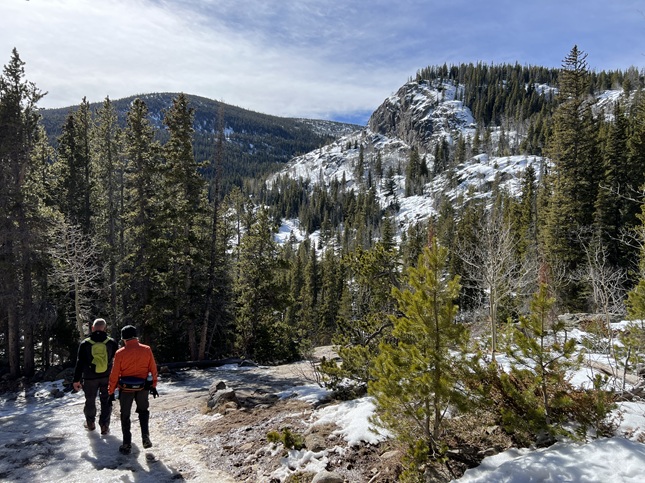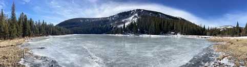 11) Lost Lake, Hessie Trailhead, Boulder County Open Space, Eldora, CO, February 9, 2026 - With Jamie visiting we are maximizing our hiking so after doing Flagstaff Mountain the previous day we were up early and back out hiking again the very next morning. This time Jamie, Jonna and Alan drove up to the Hessie Trailhead outside Eldora and did the hike in to Lost Lake. Another sign of just how bad our snow situation is rigth now is the fact that we could even drive to the trailhead. Normally, the Fourth of July road out of Eldora is closed in the winter but right now it is free of snow and ice so we could drive all the way in to the trailhead. It was clear but windy so we bundled up in layers and headed down the trail. Just past the old Hessie townsite the trail started to be covered with packed snow and ice so we put on microspikes and wore those for the rest of the hike. We had some nice views onto the surrounding mountains and this high up (~9,600 feet) there was actually some snow. Lost Lake was frozen over so at least if felt a bit like winter once we were up there. We made good time and were back at the trailhead in time to pick up lunch in Nederland on the drive back home. A 4.2 mile up-and-back hike with 850 feet of elevation gain.