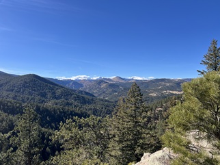 13) Chapman Drive & Tenderfoot Trail, City of Boulder Open Space and Mountain Parks, Boulder, CO, February 14, 2026 - After a couple of days relaxing to recover from all the hiking we did during Jamie's visit we were feeling a bit slothful. On a Saturday afternoon we decided to get out for another hike and since our last few hikes involved some elevation we opted to continue that by hiking Chapman Drive near the mouth of Boulder Canyon. The trailhead was recently rebuilt making it a much more formal hiking spot than it had been previously. This means a lot more traffic, particularly bicyclists who make a loop by cycling the Boulder creek bike path to the trailhead, then biking up Chapman Drive to the top of Flagstaff Mountain and then coasting down Flagstaff Drive back into Boulder. We did the climb from the trailhead all the way to the top but then came back down via Tenderfoot Trail which allowed us to avoid the bicycle traffic for half the return trip. A cloudless sky showed off the mountains of the Continental Divide which had been covered with snow by an overnight storm. Beautiful! A 5.2 mile loop with 950 feet of elevation gain.