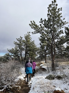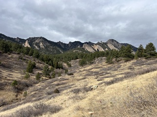 20) Homestead and Mesa Trails, South Mesa Trailhead, Boulder Open Space & Mountain Parks, Boulder, CO, March 15, 2026 - After such a dry winter we are happy for any moisture we can get along the front range. We had a small snow storm roll through dropping about half an inch of the white stuff down in Boulder and it came with below freezing temperatures so it didn't just melt out as if fell. To enjoy having a little snow on the ground we got together with our friend Desiree to hike our "short loop" from the South Mesa Trailhead. We hiked up Homestead Trail as usual and found it a muddy mess. Once we were back on the gravel of the Mesa trail the wind started to pick up a little and a few flakes fell from the sky so we decided to turn back. We skipped returning via the Towhee Trail since it would likely have also been sticky mud so we stuck with the more maintained Mesa trail all the way back to the trailhead. Not a particularly long hike but at least we got to feel a little bit of winter. A 3.2 mile loop with 600 feet of elevation gain.