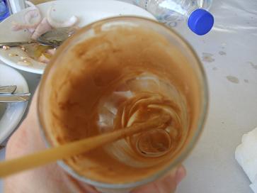 27) Jonna's first "frappe". This is the national drink of Greece and the financial coup of Nescafe. It is kind of like a coffee milk shake with lots of foam.
